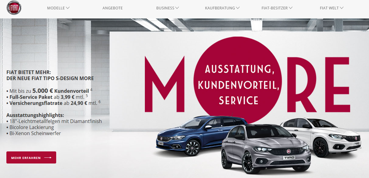 Fiat bietet mehr: Die More Sondermodelle der Baureihen Fiat Tipo, Fiat 500X und Fiat Panda bieten Käufern viele zusätzliche Vorteile – durch mehr Ausstattung bekommen Kunden mehr Komfort, mehr Technik, mehr Sicherheit und mehr Sportlichkeit. Und das zum reduzierten Preis. Derzeit erhält der Kunde beim Kauf eines der Fiat More Modelle - Fiat Tipo, Fiat 500X oder Fiat Panda More - einen Kundenvorteil von bis zu 5.000 Euro.1