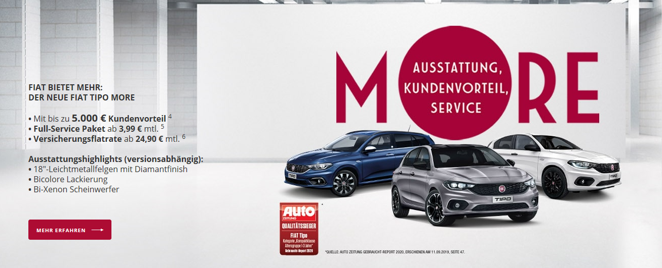 Mehr Ausstattung, mehr Kundenvorteil und mehr Service im Preis enthalten. Fiat Tipo Fiat Tipo More als 5-Türer oder Kombi in verschiedenen Ausstattungsvarianten verfügbar. Crossover Fiat 500X More basiert auf Modellversion Sport, Fiat Panda More auf Modellversion City Cross.