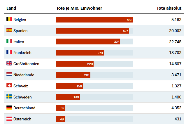 Das fällt mir seit Wochen schon auf, wie hoch die Todeszahlen in NL und BE sind. Sterben wohl auch viele in den Heimen.