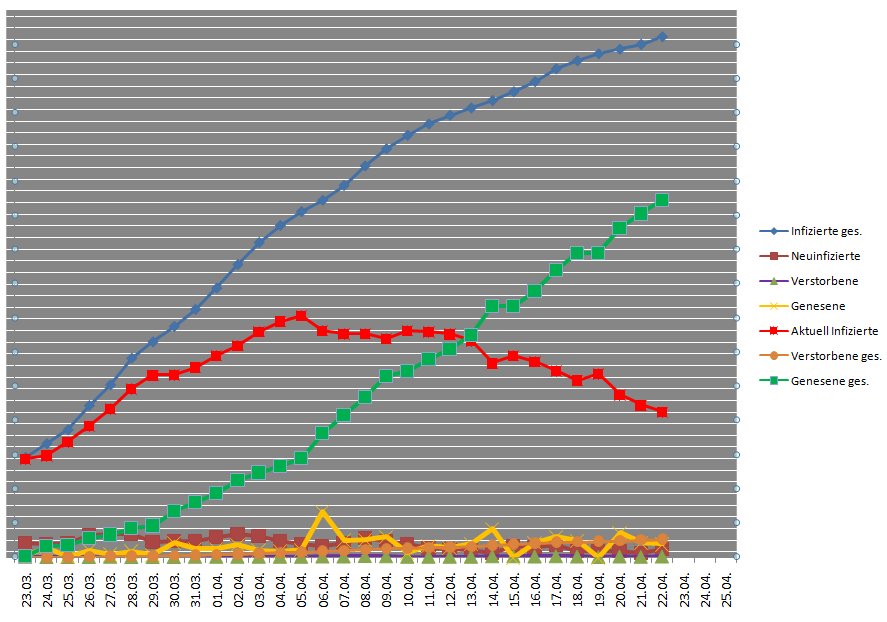 Deutschland 2.400 Neuinfizierte, eine Verdoppelung gegenüber dem Vortag! Ist uns Ostern nicht bekommen? Mal morgen schauen, ob es nur ein Ausrutscher war!