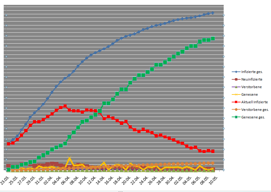 176.782, 26.313 verstorben, 56.148 geheilt!Deutschland 736 Neuinfizierte, leichter Rückgang gegenüber dem Vortag, jedoch hat die Reproduktionszahl wieder den gefährlichen Wert von 1,1 erreicht!