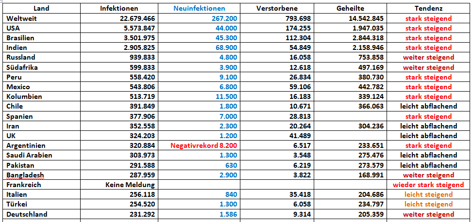 Mein Frau ist die ganze Woche schon wieder täglich an der Schule, so wie immer in der letzten Sommerferienwoche: Konferenz, Klassenräüme umgestalten, Bücher inventarisieren, etc. Die Stimmung unter den Kollegen bzgl. Corona und bzgl. des Schulbeginns nächste Woche kann man nur mit 3 Worten beschreiben: Alle sind besorgt. Letzten Endes weiß jeder, dass das mit dem Abstand halten in den kleinen Klassenräumen bei der Vielzahl Schüler absolut nicht umsetzbar ist, und vom Großteil der Schüler weiß man, dass diese in den Ferien in Hotspotregionen wie Kroatien, Bulgarien, etc. waren. Man darf gespannt sein, wie die kommenden Wochen verlaufen werden. Mir ist da schon etwas mulmig.