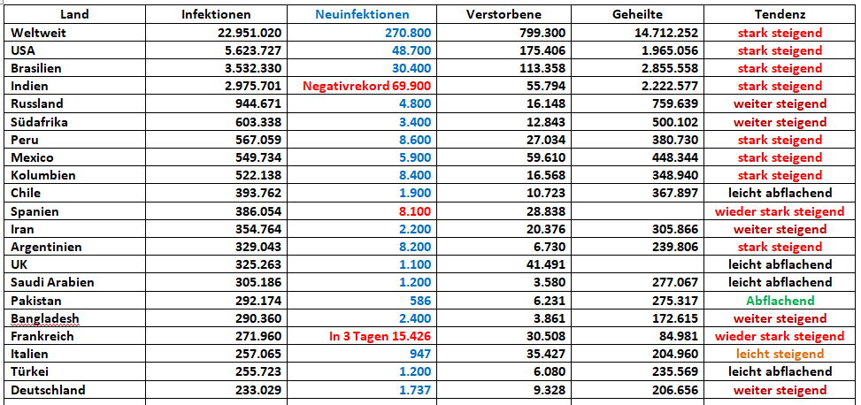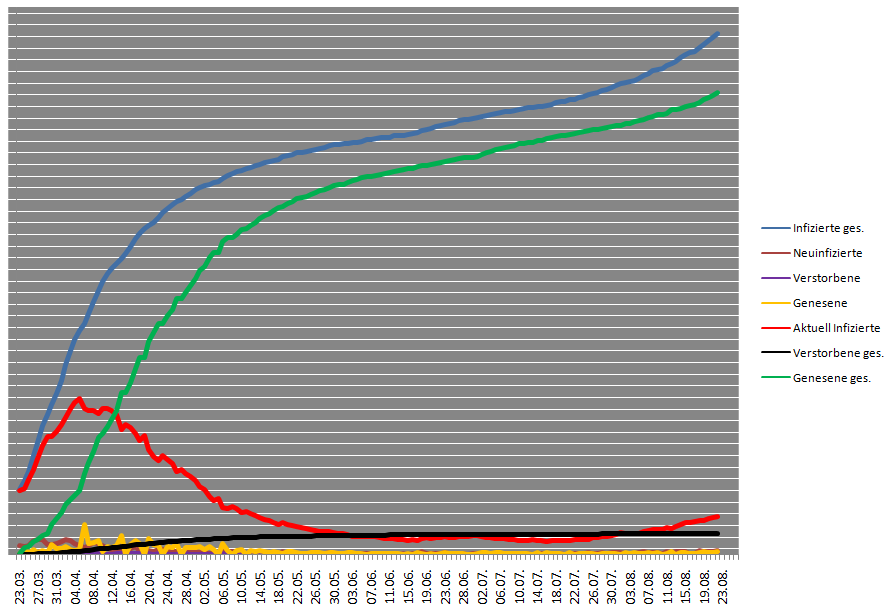 Deutschland bei mittlerweile über 2.000 Neuinfektionen pro Tag. Es waren mal 200-300 vor einigen Wochen. Laut RKI sind die hohen Zahlen in der Hauptsache auf private Feiern und Urlaubsrückkehrer zurückzuführen. Vielen Dank auch, Ihr Sorglosen und nur bis zur Nasenspitze denken könnende...