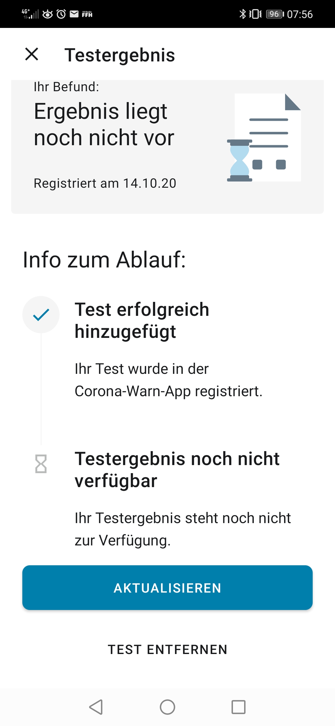 Und die Corona App war jetzt in meinem Fall sinnlos, da ich bis dato kein Ergebnis bekommen habe, obwohl ich den QR Code am 14.10 registriert hatte.