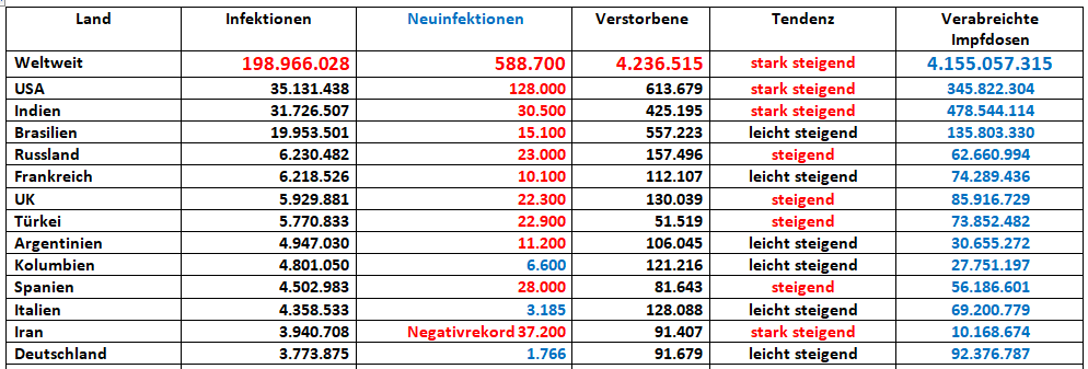Ihr müsst ja auch immer im Hinterkopf behalten, dass es wenig nützt wenn z.b. die Europäer mehr oder weniger durchgeimpft wären, und in anderen Kontinenten ist man erst in vielen Jahren soweit. Es findet ja immer Reiseverkehr (Tourismus, Business) statt so dass immer wieder Infizierte hier aufschlagen und es weiter verbreiten. Insofern werden wir damit noch sehr viele Jahre zu leben haben, ähnlich der Grippe....