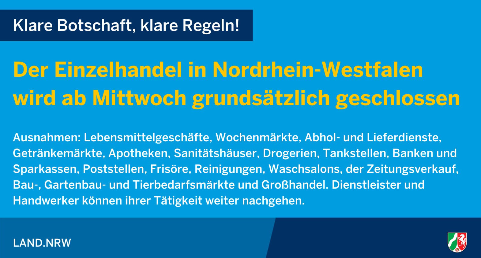 Ausgangsperre + alles dicht bis auf Lieferdienste (mit hygenischen Maßnahmen/Auflagen), medizinische Versorgung & Lebensmittelgroßhandel - die mit Eingangsbeschränkung.