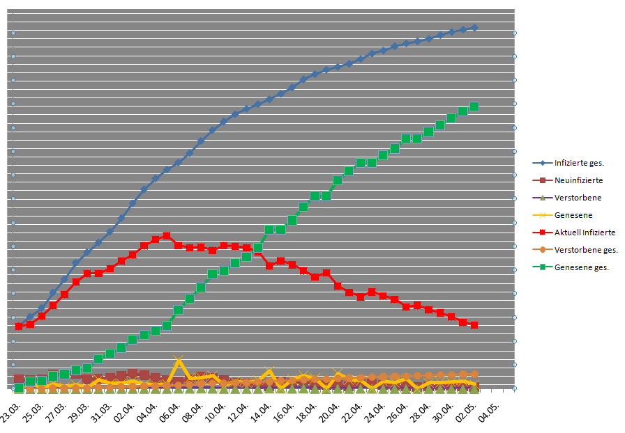 164.967, 6.812 verstorben, 129.000 geheilt!Immer noch sehr positiv stehen Österreich und Schweiz da! Unter 100 Neuinfizierte!