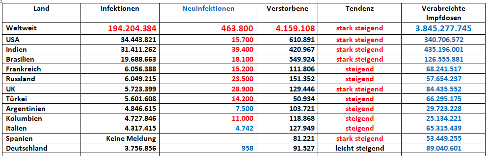 Was mich ärgert ist das langsame Impftempo. Erst war der Impfstoff knapp, da gab es den Kampf um die Impfung mit allen Tricksereien und Betrügereien. Jetzt gibt es genug Impfstoff und wir eiern rum; nichtmal die Hälfte der Bevölkerung ist doppelt geimpft (Stand heute), und es geht immer zäher voran.