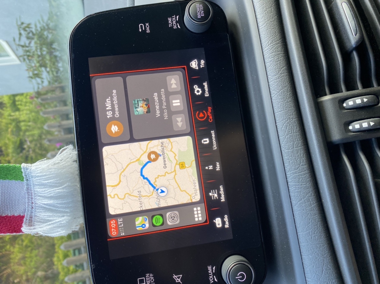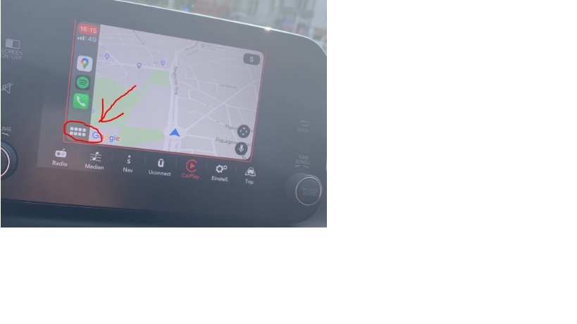 Dabei fiel mir als erstes die Apple-Software die neben uConnect auf dem Autoradio(in dem der Apple Chip verbaut ist) selbst laufen muss eben keine Softwareschnittstelle(API) bietet um vom Vollbild wieder zurück zum Radio zu kommen. Also hat man die Notlösung gewählt und auf geschätzte 6" Anzeigebereich reduziert um das Radio-Menü unten anzuzeigen um wiederum zum Radio zurückkehren zu können.