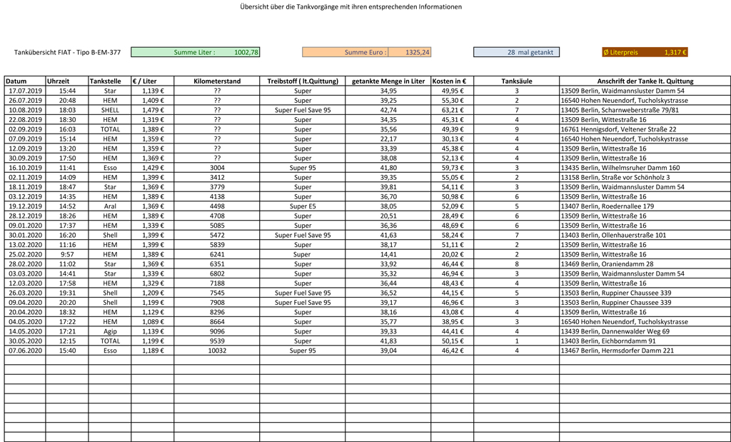 aber ich habe seid Beginn an die Tankrechnungen in Excel untergebracht.