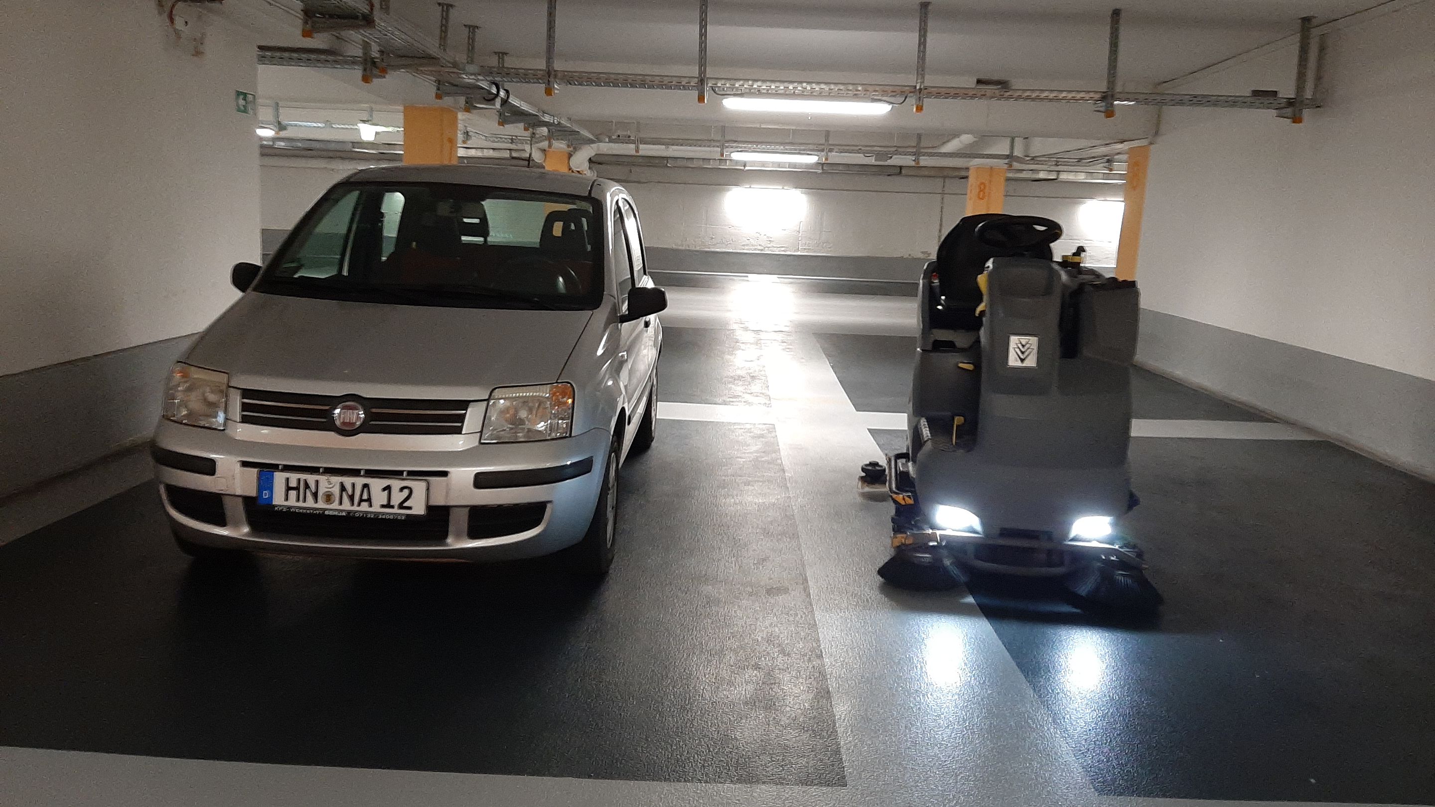 Aber sag mal: Ist das eine Tiefgarage oder ein Parkhaus? Hat da jemals ein Auto geparkt oder gekurvt? Das ist ja fast so blitzblank sauber wie bei mir in der Werkstatt. Keine Reifenspuren, nix...