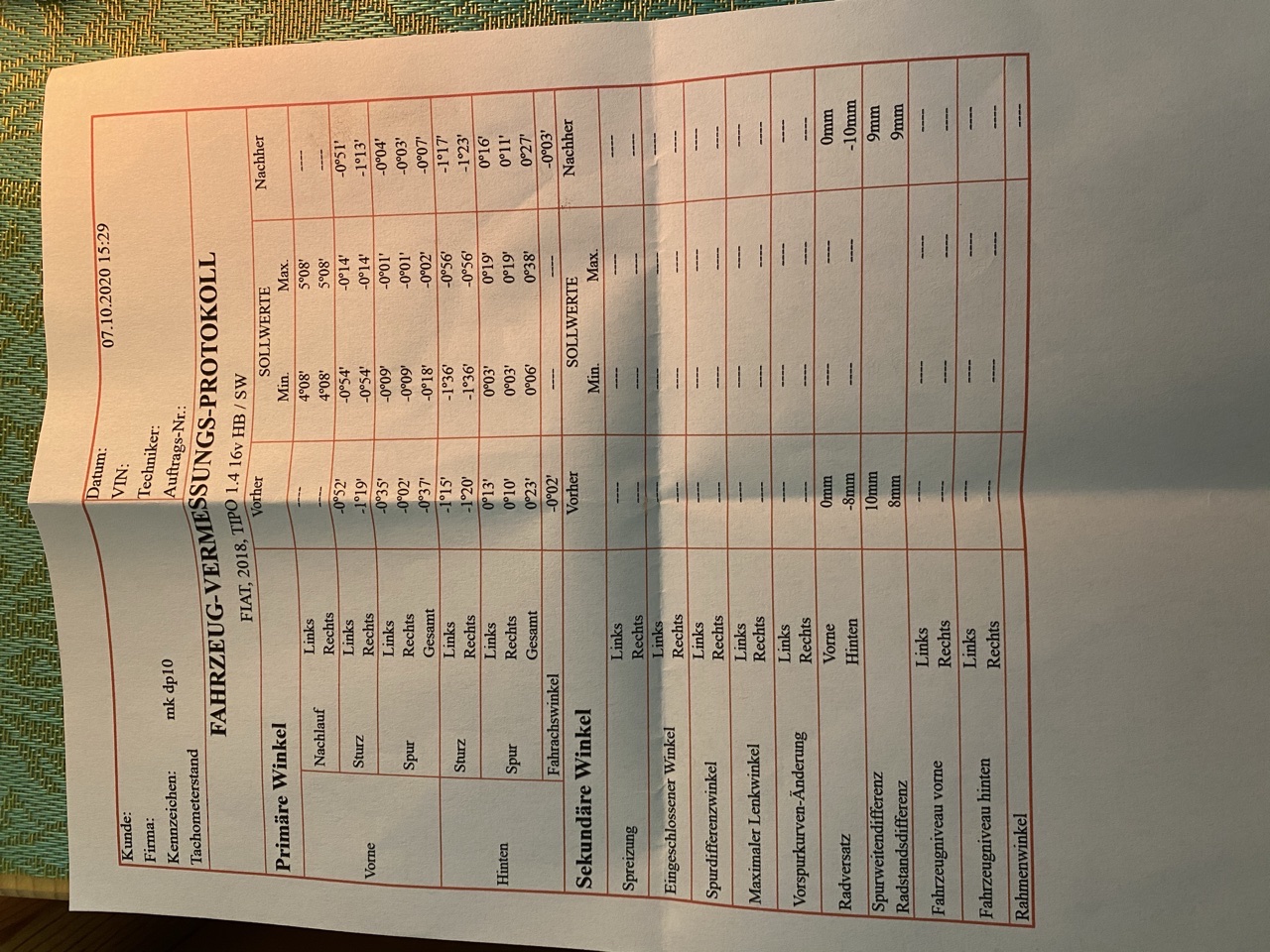 Ich kann sicherlich mit dem negativen Sturz leben (ich weiß, leicht erhöhter Reifenverschließ innnen, korrekt?!). Aber aus reinem Interesse will ich wissen was es damit auf sich hat, dass die Werte nicht korrigiert wurden.