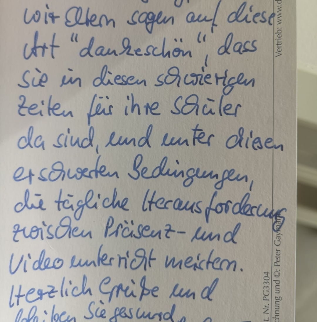 • Bei meiner Schwägerin (Sekundarstufe 1) und unserer Tochter (Ref. Grundschule) sieht es nicht anders aus inkl.digitalem Elternabend freitags bis 21:00 Uhr. Unvorstellbar, wenn ich einem meiner Mitarbeiter sagen würde, dass er für lau freitagabends bis 21:00 Uhr bleiben sollte. Aber es gibt immerhin Eltern, die das Engagement und die immense Mehrarbeit anerkennen: