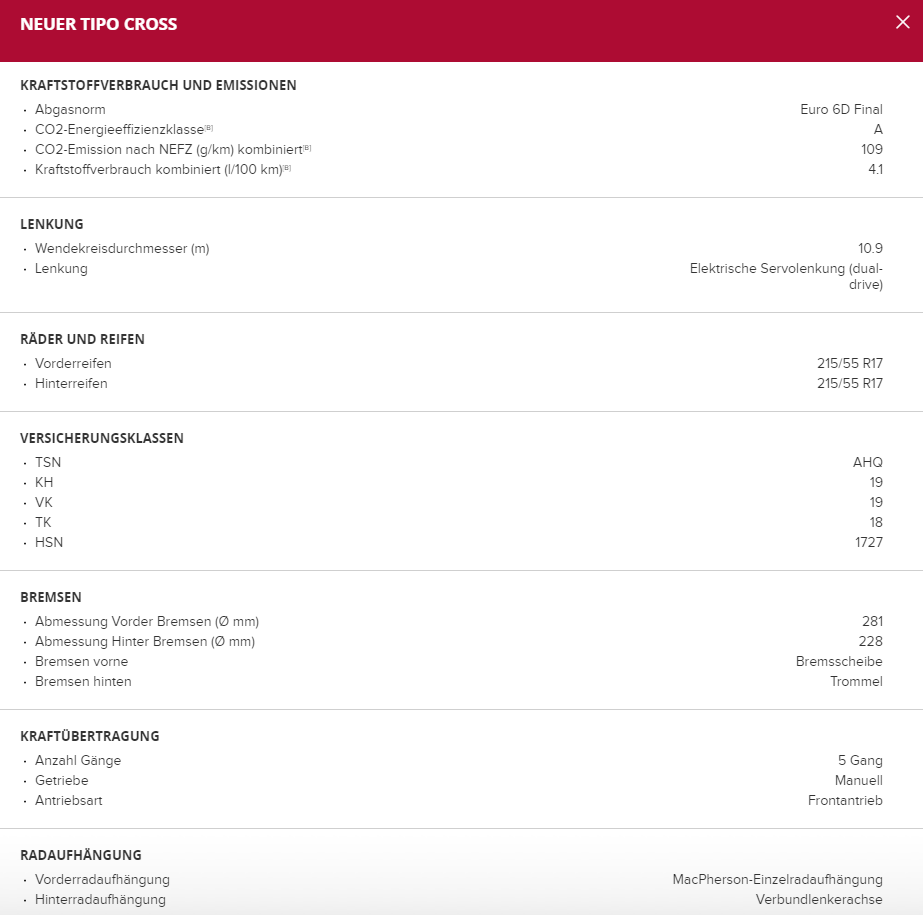 Tipo Cross - Technische Daten 1.3 70KW (95PS)