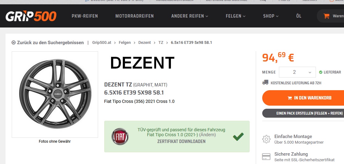 Habe mal für 945,12 Euro einen Satz 235er Winterreifen auf 17-Zoll Alus drangebaut. Geht schon:Ja aber in Österreich müssen wir zur KFZ Prüfstelle der Landesregierung, weil in Österreich ist nur ein ECE R124 Gutachten Eintragungsfrei und das gibt es für den Tipo Cross mit den Reifen 215/60R16 oder 215/55R17 nicht. Und mit den Reifen vom normalen Tipo geht der Tacho nicht richtig. Alle Felgen mit ABE Gutachten müssen in Österreich Eingetragen werden.