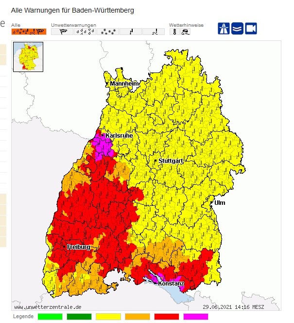 Bei uns jetzt auch schwül bei 24° . Für heute Nachmittag sind schwere Gewitter mit unwetterartigen Niederschlägen (Starkregen und/oder Hagel) vorhergesagt.