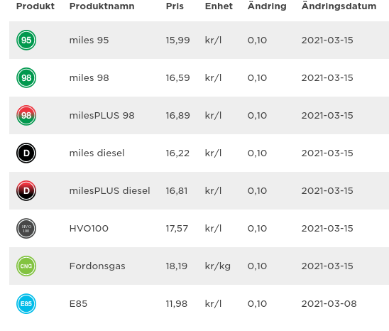Folgend ein Screenshot der Kraftstoffpreise bei der Tankstellenkette "Circle K" (gehören zu den eher teuren Anbieter) am 16 März 2021.