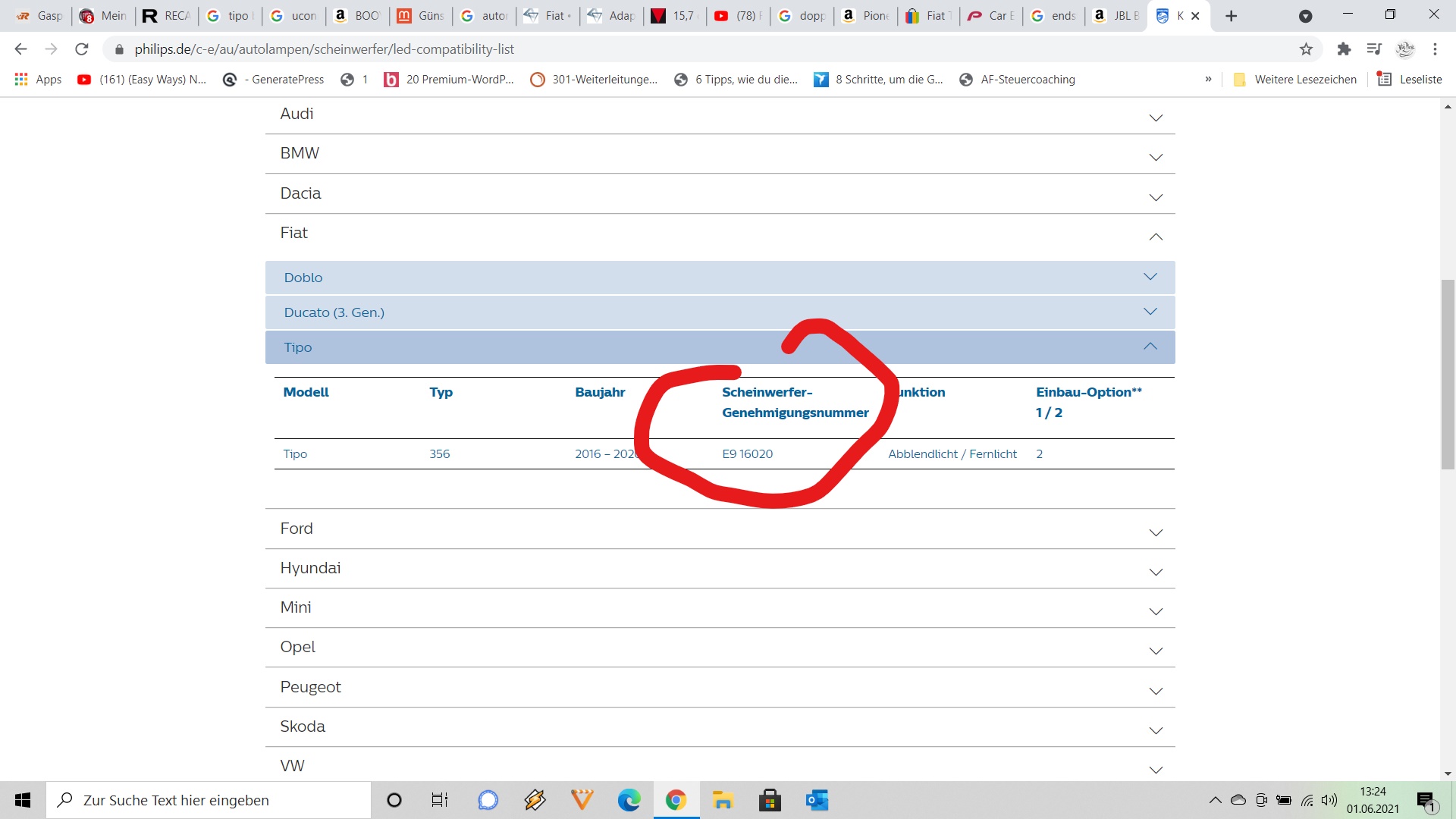 HSN: 1727 / TSN: AHR -> 1.6D Multijet 88KW, -> Abblendlicht -> Fernlicht