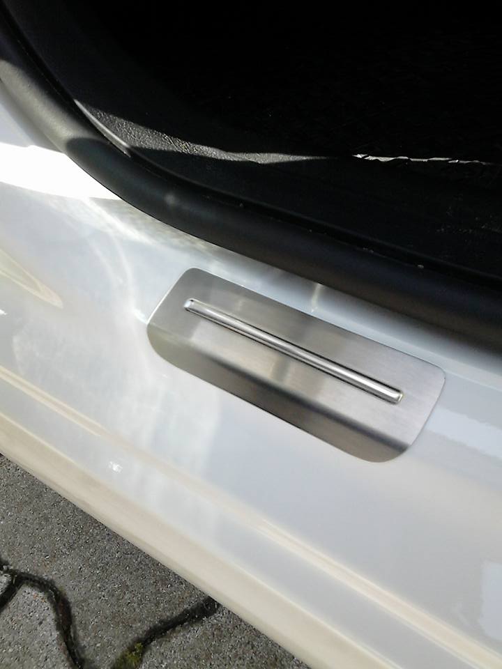 Negatives? Nun auch wenn die Dinger bombenfest sitzen und relativ bündig anliegen, glaube ich, dass sich trotzdem ab und an wasser drunter sammeln wird. Das ist nicht gefährlich, ist ja nur geklebt und nicht geschraubt, zudem rostfreier Edelstahl, aber ab un an wird hier das wasser unter der Leiste heraussickern. Für Fanatiker wie mich, die sogar ihre Einstiege regelmäßig wachsen, ein Alptraum, für Otto-Normalo völlig vernachlässigbar. Hinten sind die Leisten wirklich niedlich, ich hab schon den Plan gefasst einen Aufkleber hinzumachen "bitte richtig zielen" denn hier müssen die Hinterbänkler schon genau zielen um die kleine Einstiegsleiste zu "treffen". Es macht aber auch sinn, denn der schweller steigt recht früh an und so hätte man die leiste sogar noch in eine ansteigende Form pressen müssen.