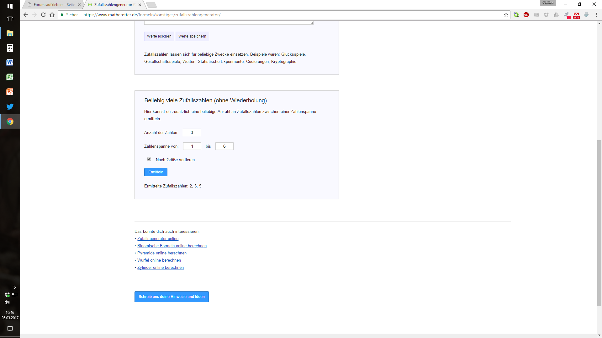 , werde ich nen Zufallsgenerator nutzen: https://www.matheretter.de/for…s/zufallszahlengenerator/Einen Moment bitte schön!