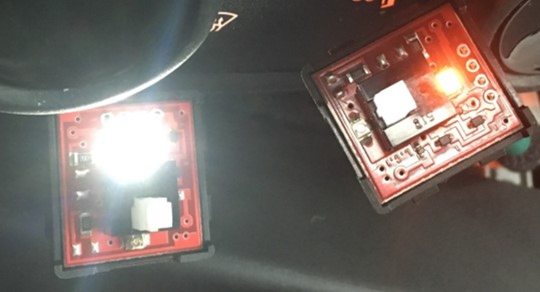 • Da ich die nackten Platinen ja schon in der Hand hatte kann ich zumindest bei den unteren Teilen (USB, AUX, Strom und Sitzheizung) sagen, dass es definitiv rote Smds sind und keine Folie. Bei den Sitzheizungsschaltern sind es sogar zwei LEDs. Eine fürs Bildchen in rot und eine für Heizung an in orange.