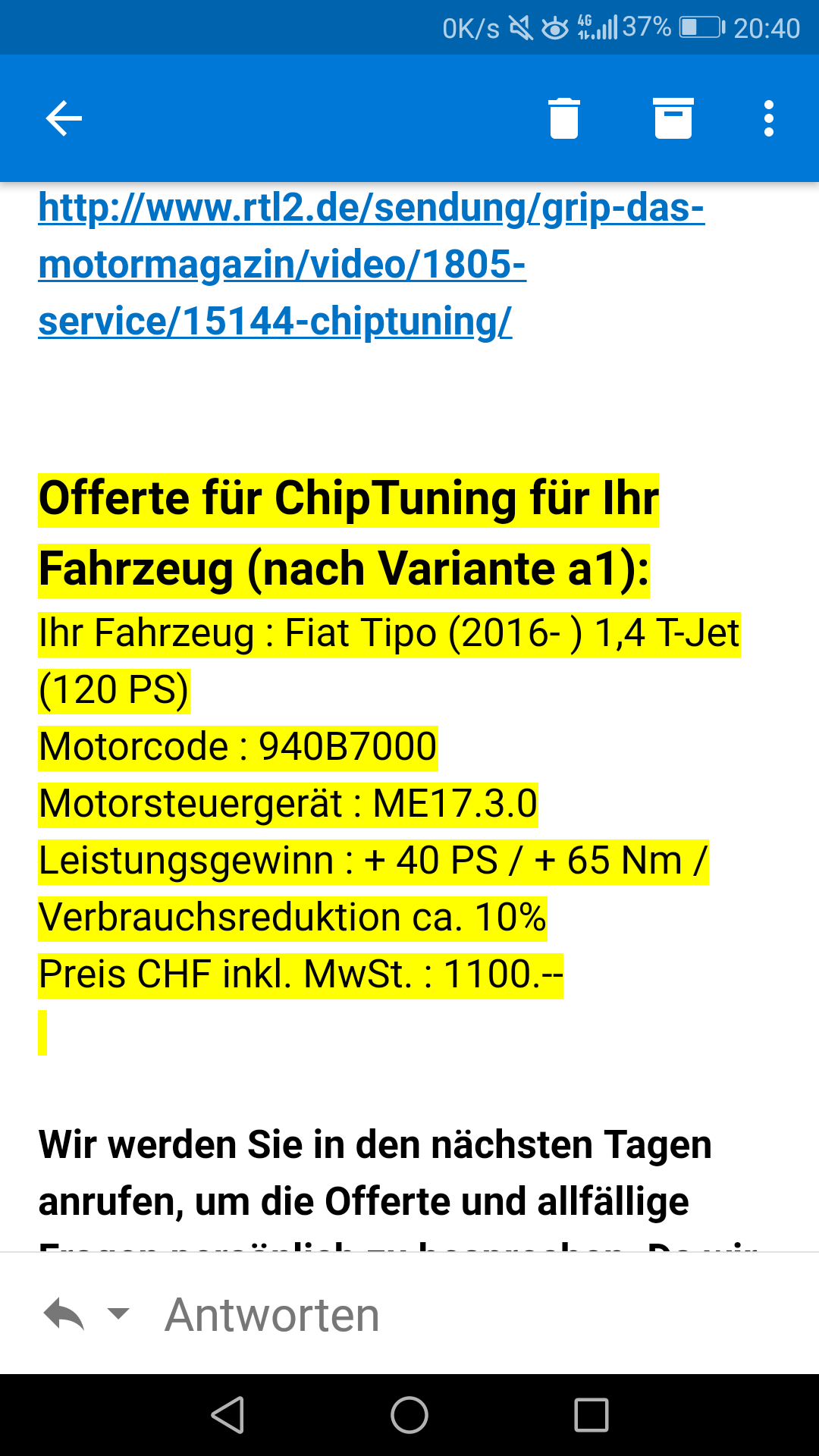 Also ich habe bisher nur bei einem Diesel (Croma 150PS-Diesel von unserem Junior-Chef) "Erfahrung" mit Chiptuning gemacht. Da war eine Box drinne mit Software die immer speziell für das Fahrzeug heruntergeladen und auf die Box installiert wurde. War auch mehrstufig einstellbar mit einer Fernbedienung. Der Wagen hat damit ordentlich mehr Bumms gehabt, aber eine so starke Erhöhung der Belastung? Danke, nicht für mich.