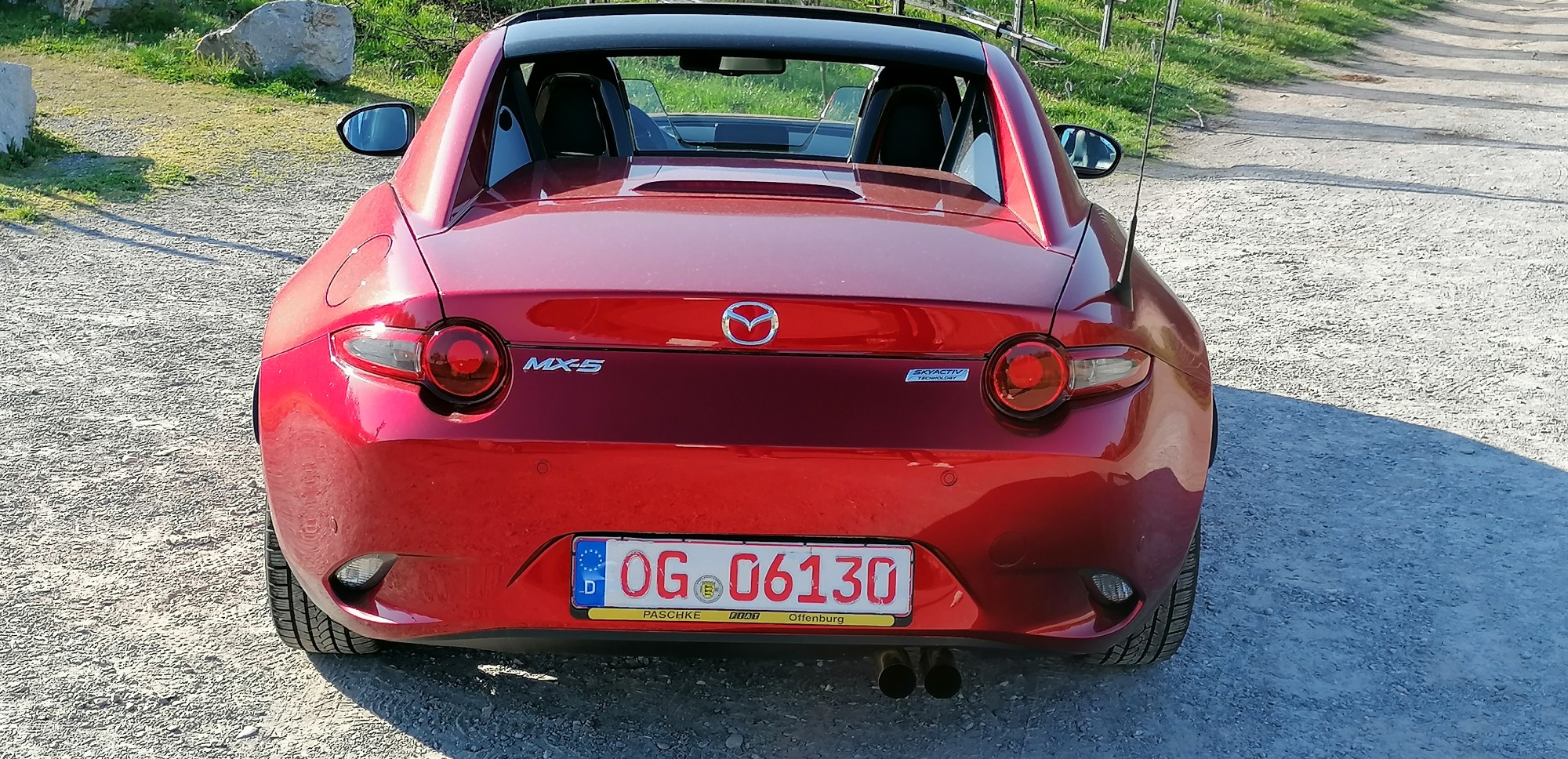 Wobei der hier abgebildete MX-5 der RF ist und damit das eher selten anzutreffende Modell mit dem versenkbaren Dach und den feststehenden Finnen. Der "normale" MX-5 hat nach wie vor ein Stoffverdeck und ist nach dem Zurückklappen des Verdecks völlig offen.