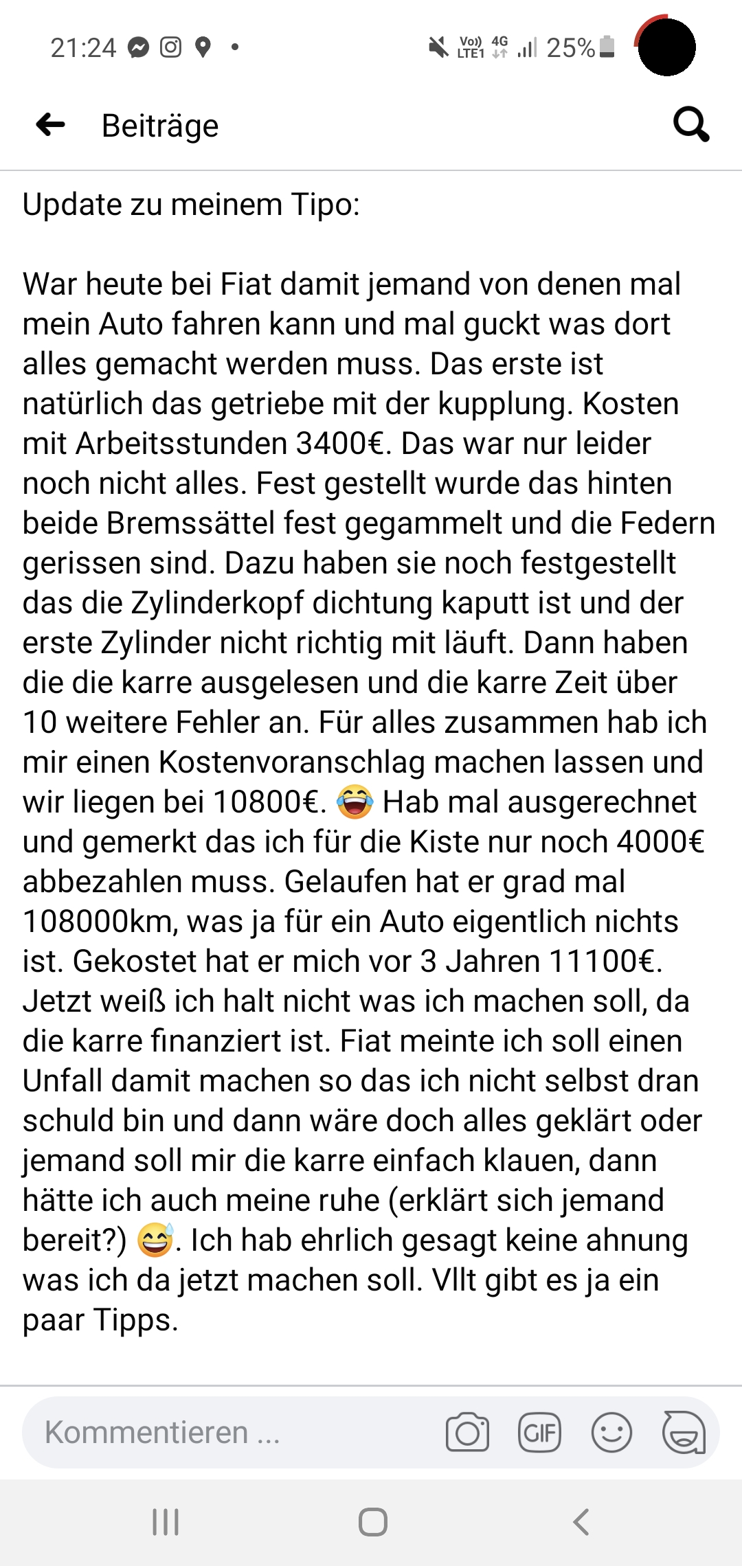 Jemand in der Facebook Tipo Gruppe heult grade auch rum das sein Tipo reperaturen in höhe von fast 11'000 Euro benötigt. Wenn man aber sieht wie er mit dem Tipo umgegangen ist und das Service für ihn ein Fremdwort ist muss man sich echt nicht fragen das der Tipo jetzt hinüber ist nach etwas mehr als 100'000km