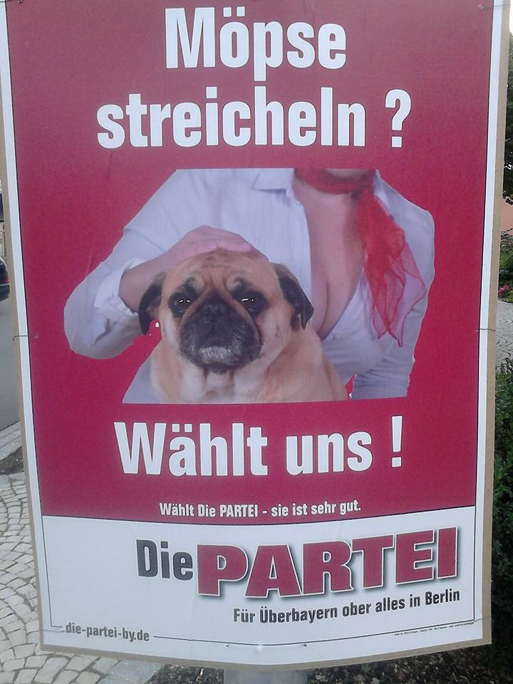 Auf meiner sonntäglichen Runde durch die Lande, entdeckte ich im Nachbarort dieses Wahlplakat! Im Sinne unseres Forums und der allgmeinen Mops-Begeisterung, appeliere ich an alle, dieser Partei mit den "schlagenden Argumenten" ihre Stimme zu geben. Der Initiator dieser Kampange, war wohl beim Tipo Stuhlkreis in Aschaffenbrug dabei. Also gebt dem Mops...pardon den Möpsen eure Stimme! @Fiatfantom das dürfte dir ein spezielles Anliegen sein!