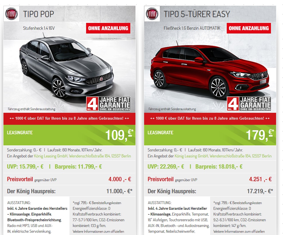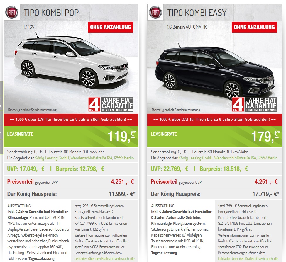 Wow der Preis ist heiß, zu den Konditionen würdest du den niemals bei der Fiat-Bank bekommen! Ohne Anzahlung für etwas um die 100 Euro? Einsacken, mitnehmen, die 3 Jahre fahren und danach ein neuer her, fertig ist die Maus! Für Leute die oft wechseln oder das Auto wirklich nur als günstigen Gebrauchsgegenstand nutzen einfach unschlagbar.