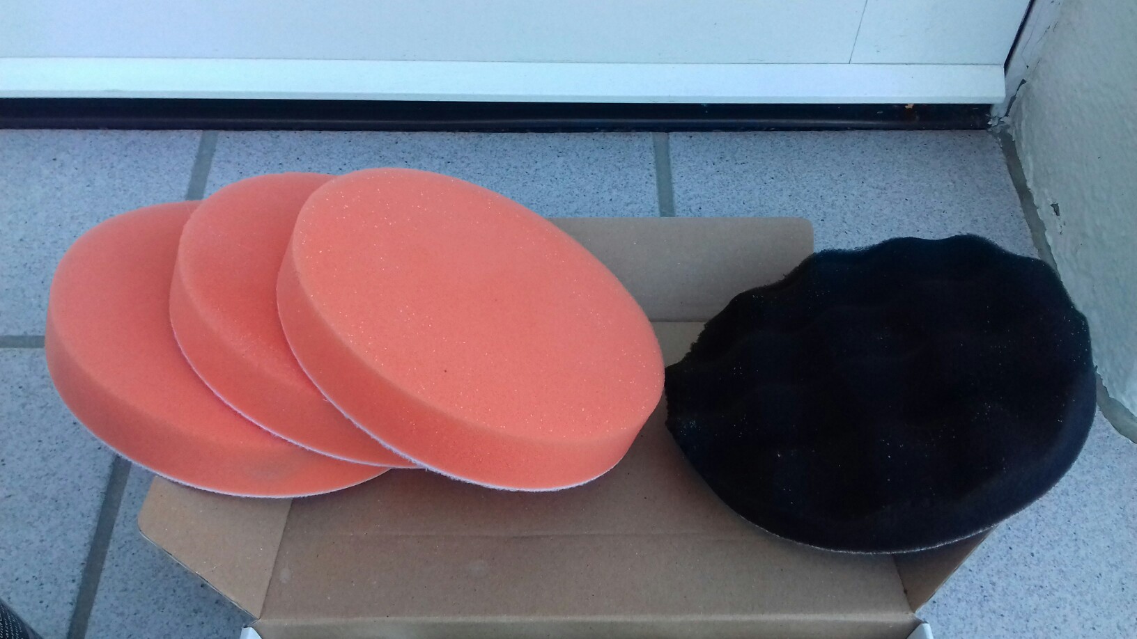 Ich bestellte u.a. ein Testset mit Schleifmitteln in drei Körnungen zusätzlich anti Hologramm Politur und Canuba Wachs Versiegelung. Als "Hardware " verwendete ich meine alte Nordex Poliermaschine und für die drei Polierstufen mittel harte Polierscheiben (orange) und für die Hologramm entfernung eine weiche gewaffelte Scheibe (schwarz).