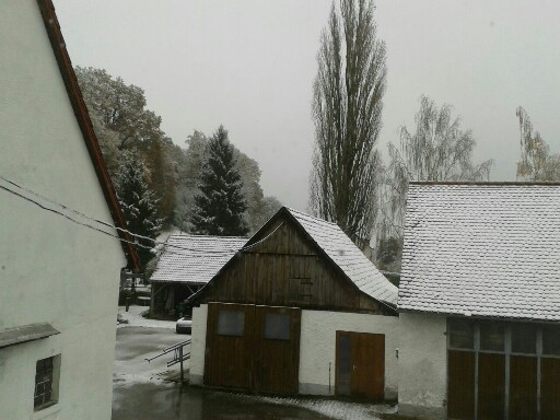 Jap bei uns ist aktuell alles weiß. Erst fing es mit Schneeregen an und dann kams kräftig. Weiße Dächer und Gärten, Straßen aber noch frei. Und was sah ich dann? Jap den ersten Salzwagen der nach Kräften den Mist auf die Straße pumpte....Jungs der Winter ist da!