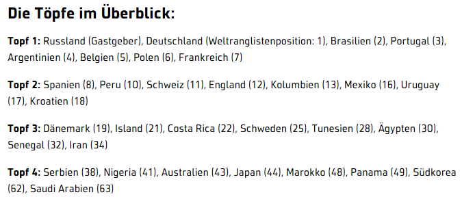So werden beispielsweise Peru, Kolumbien und Uruguay aus Topf 2 nicht in die gleiche Gruppe wie Brasilien oder