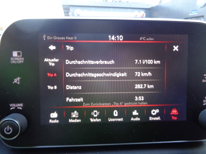 Der Wagen war voll getankt und ich legte damit 319 Km zurück. Der Bordcomputer präsentierte mir stolz einen Durchschnittsverbrauch von 4,7 Liter nach 80% Autobahn 15% Landstraße und 5% Stadtverkehr. Bevor ich den Wagen zurück brachte tankte ich wieder voll und es gingen 18,7 Liter in den Tank.