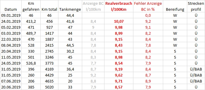 Ich führe richtig Buch, denn dem BC kann man nicht trauen, er zeigt im Schnitt etwa 9% zu wenig an.