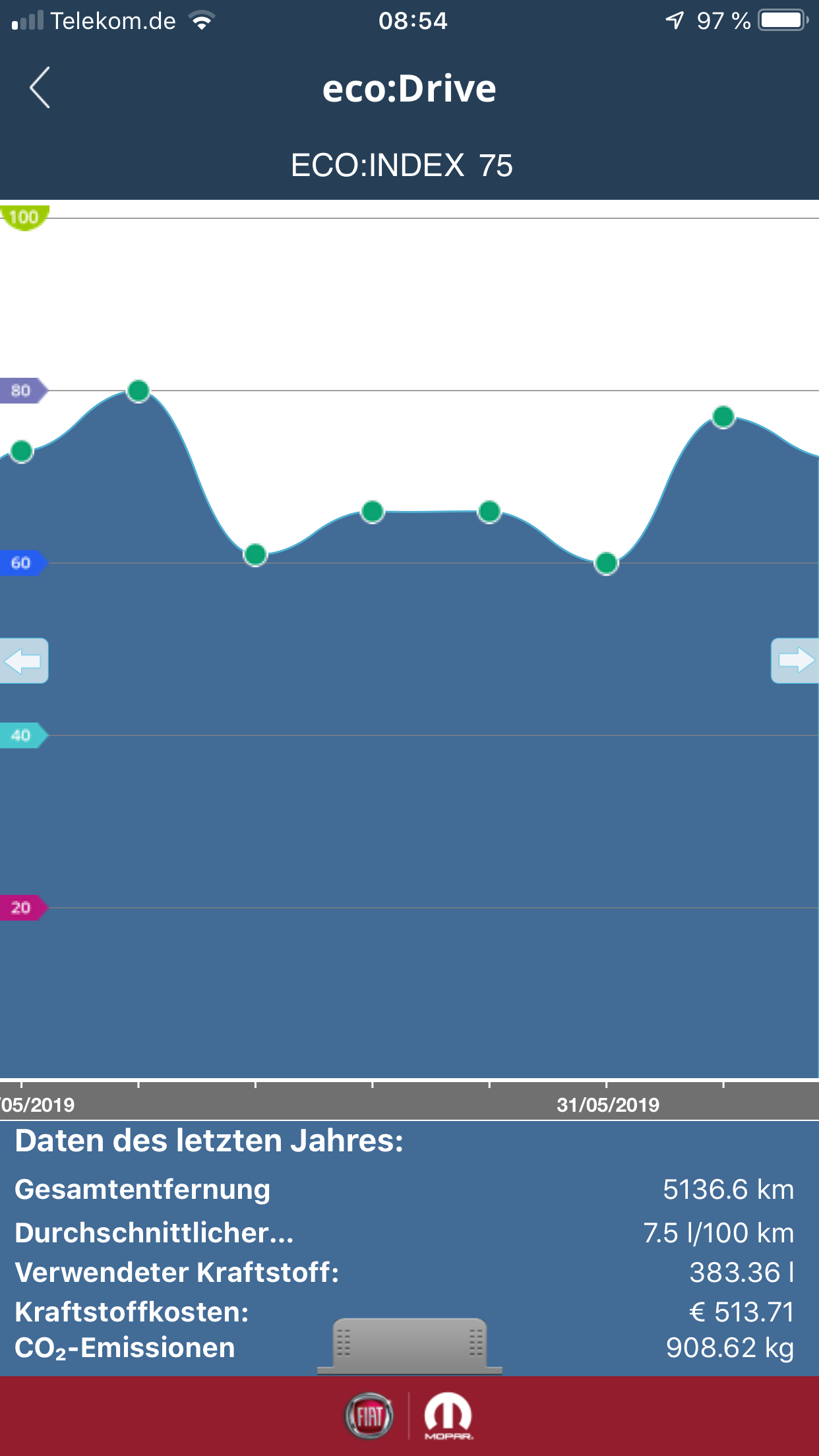 weiterhin habe ich auch einen Grande Punto Diesel gefahren.....damals war meine tägliche Strecke 35 KM mein Verbrauch lag je nach Gasfuß bei 4,7- 5,2 Litern......auf der Autobahn auch mal 6 Liter, mit einem Tank bin ich also so 800 - 900 KM gefahren und nun willst Du mir erzählen mit einem 95 PS Benziner fährst Du 514 KM und der Tank ist fast halb voll..... :D :D :D