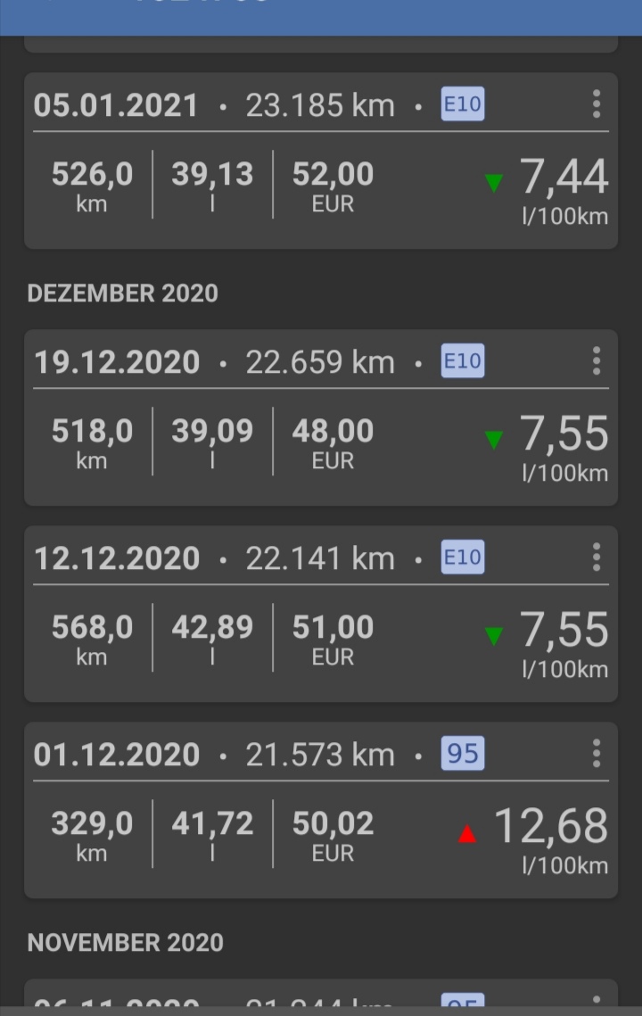 Aber die BC-Anzeige interessiert nicht, ich rechne immer von Hand nach. Mache ich seit 1982, also seit meinem ersten Auto. Da habe ich früher alles aufgehoben. Jede Rechnung, jede Quittung...irgendwann hatte ich 5 dicke Ordner voll im Regal stehen, dann habe ich es entsorgt.