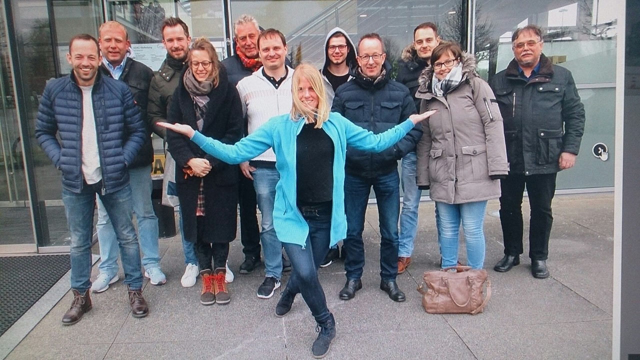 Eine blonde Frau die das Gruppenfoto versaut?