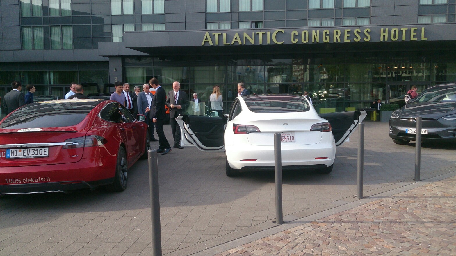 Der weiße Tesla Model S ist ja in Europa erst ab 2019 zu bekommen, aber ein Privatfahrer aus Kalifornien hat sein Fahrzeug nach Europa verschifft und tourt nun durch Europa um sein Fahrzeug zu refinanzieren. Er kam heute um 17:30 mit zwei Begleitteslas bei unserem Tagungshotel vorgefahren und wurde begutachtet. Danach fuhr er nach Hilden, denn ein dort ansässiger Bäckereibetrieb, der komplett auf e-Autos umgestellt hat und damit stark kosteneinsparend und umweltneutral agiert, hat wohl die Einladung ausgesprochen.