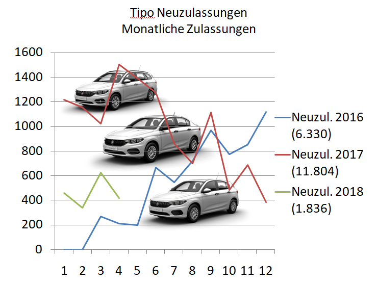 • Ich habe heute mit meinem Fiat Amigo gesprochen, da ich einen weiteren Tipo Kombi Turbo auf die Straße gebracht habe. :D Nachdem ich mich beweihräuchern hab lassen, ein jo ich habs ja so gern, fragte ich gleich mal "Jung was ist mit euren Verkäufen los". Da meinte er, die Zahl müsste doch ein schlechter Scherz sein. Gerade im April hat Fiat massenweise Tipo-Pakete an die großen Händler verkauft, wo man eben mal 30 bis 50 Tipos abnehmen musste um diese dann als Tageszulassungen auf den Hof zu stellen. Ergo sind mindestens 250 bis 300 Eigenzulassungen der Händer dabei. Was sagt das dann aus?