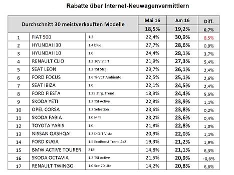 Das sind gute Nachrichten für Neuwagen-Käufer: Im Juli wurden bei Internet-Vermittlern bei den 30 meistverkauften im Schnitt 19,2 Prozent Rabatt gewährt. Das zeigt die aktuelle Rabatt-Studie des Center Automotive Research (CAR) an der Universität Duisburg-Essen. Die Autobauer leiden unter hohem Verkaufsdruck und bringen ihre Produkte unters Volk - eine der wenigen Ausnahmen ist ausgerechnet die Krisen-gebeutelte Marke VW.