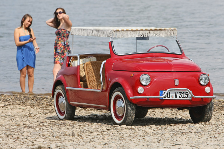 Sommer 1958. Eine seichte Brise streicht die Küste der italienischen Mittelmeerinsel Capri entlang und umweht die im Hafen liegenden Luxusyachten. Auf dem Kai wartet ein einzigartiges Fahrzeug darauf, die illustren Passagiere ins Dolce Vita der Nachtclubs zu begleiten - der Fiat 500 Jolly, besser bekannt unter dem Spitznamen Spiaggina, zu Deutsch so viel wie Liegestuhl. Der Fiat 500 Jolly war ein sogenanntes „Beach Car", gebaut hauptsächlich, um damit an den Strand zu fahren.