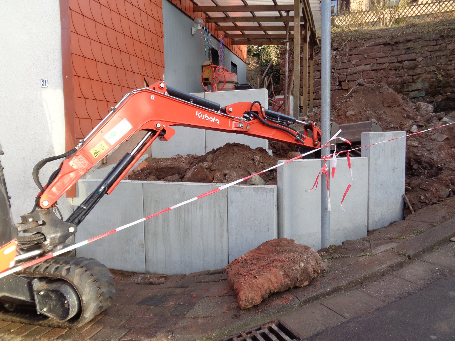Manni, es ging halt nicht anders. Eine Sandsteinmauer dieser Größenordnung mit verschieden großen Steinen hätte mich nur als Reparatur ca. 25.000€ (!) gekostet. Das nur weil hinten dran ein nicht abstützbarer Steilhang ist. Diese alte Mauer hält den ganzen Hang zurück. Aber wenn sich schon Blocks von ca. 50x50cm aus der Mauer rausdrücken, ist schon alles zu spät.