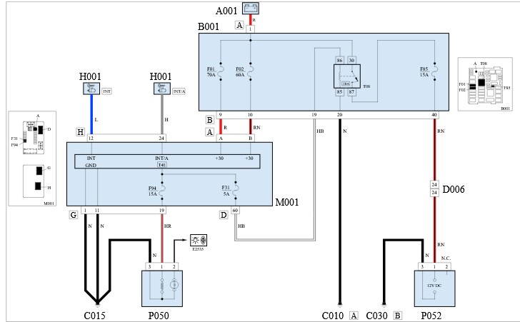 Der Stecker D006 sitzt hier:Wenn man über die F97 geht, dann müsste man ein Relais im hinteren Stromverteiler nachrüsten, so wie es vor 05/2018 bestückt wurde: