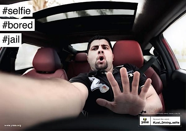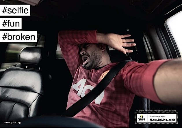 Kürzlich wurde ermittelt, dass 9 Prozent aller Autounfälle durch Selfies am Steuer verursacht werden. Wir finden die Zahl zwar sehr hoch gegriffen, aber bestimmt gibt es viele Fahranfänger, die sich unvernünftigerweise mit dem Smartphone am Lenkrad fotografieren. Eine Printkampagne der Youth Association For Safety Awareness (YASA) widmet sich dem Problem und zeigt, wie ein Selfie aussehen könnte, wenn es Schuld an einem Unfall war.Auf den Motiven der Kampagne „#Last_Driving_selfie“, die die Agentur Bold entworfen hat, sind Männer mit entsetzten Gesichtern zu sehen, die schützend ihre Hände vors Gesicht heben. Im Hintergrund, also außerhalb des Autos, schleudert die Landschaft vorbei. Unterstützt werden die Bilder von den passenden Hashtags wie #broken oder #jail. Vielleicht sind wir einfach aus dem Alter raus, aber: