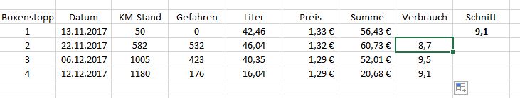 Würde mich freuen wenn jemand den Fehler in meiner Tabelle findet. Habe ich mich doch nur verrechnet?Ich weiß, einfahrphase & so. Aber ohne Klima, sehr gemäßigte, vorausschauende Fahrweise und trotzdem 9l? Das kann doch nicht sein..