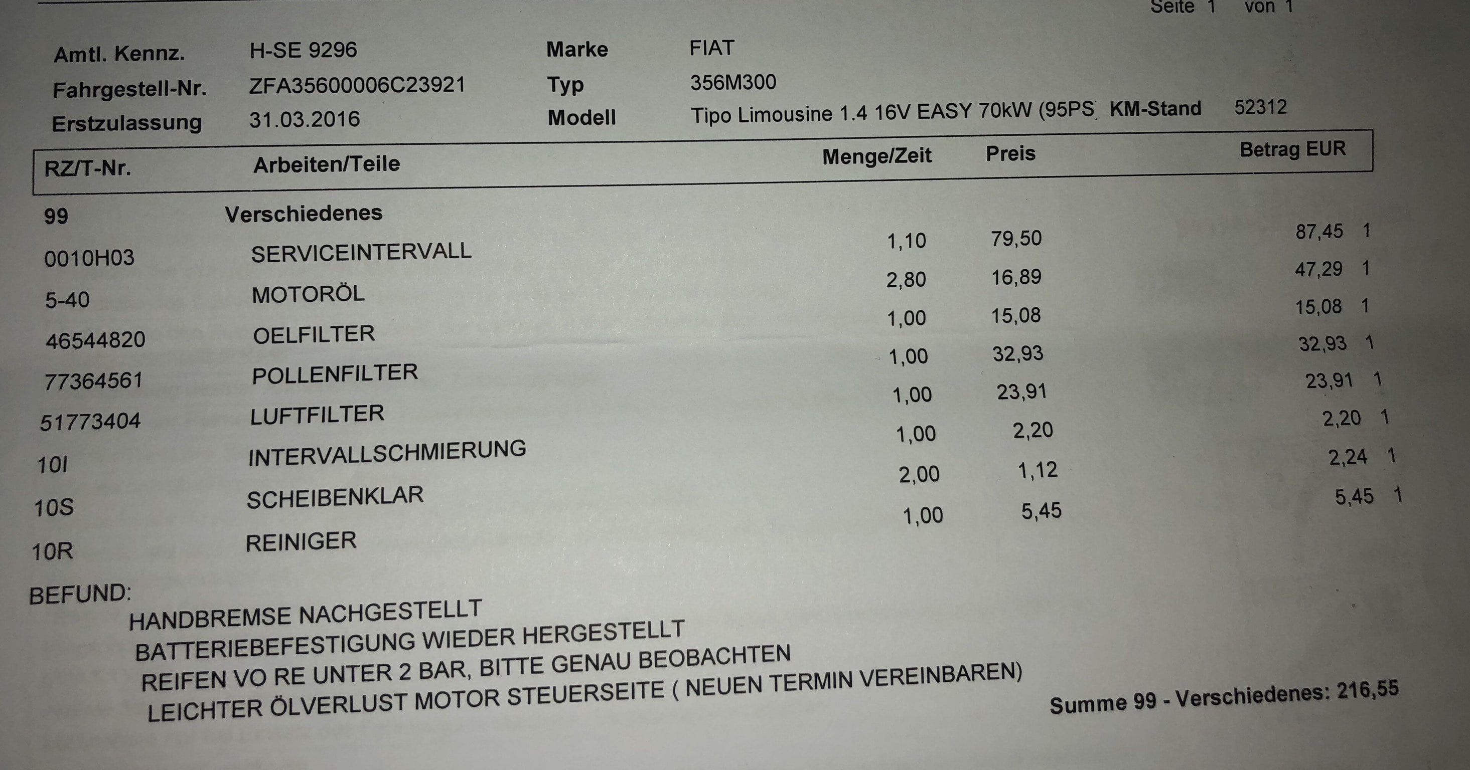 Dort hätte ich statt den 241€ bei Fiat, eben nur komplett 150€ gezahlt... (incl. Ersatzteile und Öl).