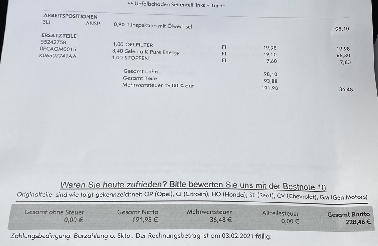 Meine erste Inspektion wurde noch im Autohaus vor meinem Kauf gemacht.Der stand 11 Monate als Tageszulassung im Ausstellungsraum mit 20km auf der Uhr.