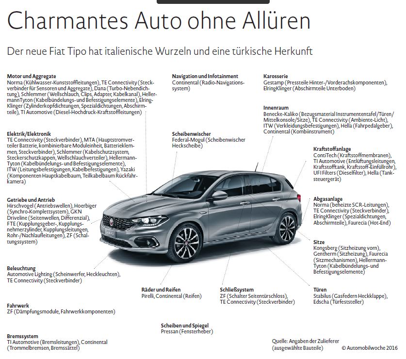 falls es Euch interessiert (und ihr es nicht ohnehin schon wusstet ;-), hier eine Übersicht der wichtigsten Zulieferer des Fiat Tipo, Modelljahr 2016.