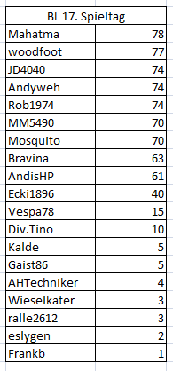 Ralf war am 17. Spieltag unser Bester, 7 von 9 Punkten :thumbsup: